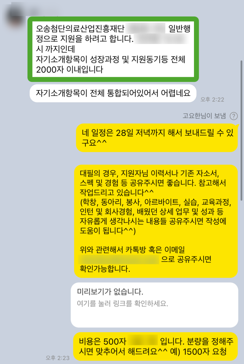 진짜 이건 거의 대필 수준으로 갈아엎었어요! 고객님이 전에 쓰셨던 자소서를 들고 오셨는데, 글자 수도 안 맞고 문장도 어색하고… 첨삭하면서 거의 다시 짰다고 봐야 해요 제발 다음엔 미리미리 와주세요..! 그래야 저도 여유 있게 도와드릴 수 있거든요