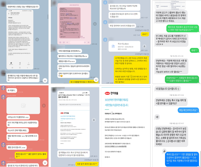 저는 매년 대기업, 공기업을 포함한 다양한 기업의 채용에서 합격자를 배출하고 있습니다. 저의 컨설팅을 통해 많은 분들이 꿈을 이루셨습니다. 이제 당신이 주인공이 될 차례입니다!
