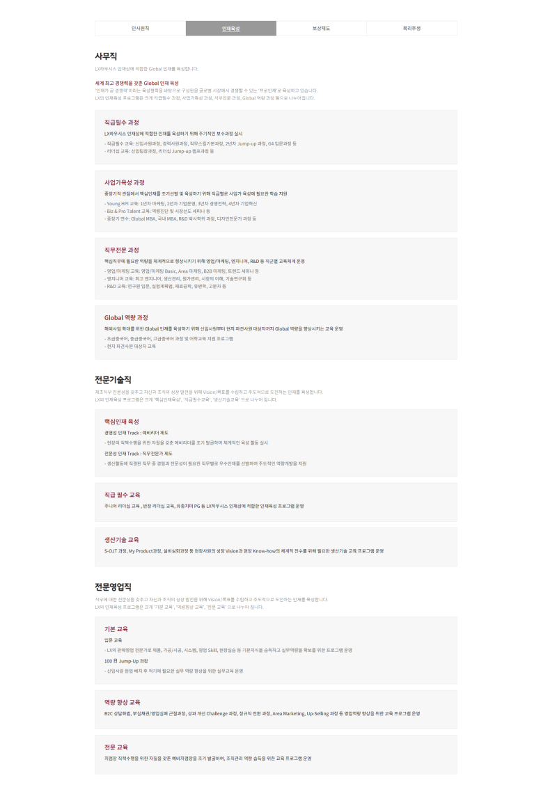 - 인재상: 창의적이고 혁신적인 인재, 고객을 최우선으로 생각하는 인재, 협력적인 인재, 책임감 있는 인재